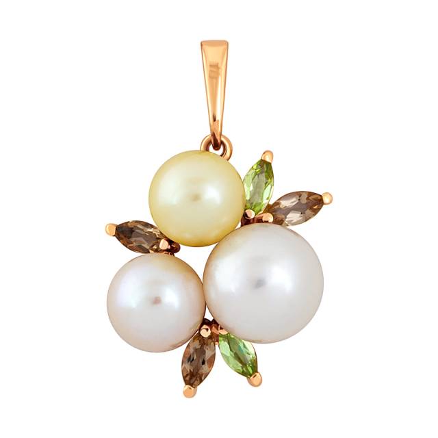 Кольцо из красного золота с хризолитами, ситаллами и жемчугом (042220)