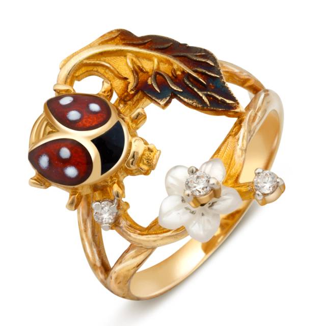 Кольцо из жёлтого золота с цирконами, перламутром и эмалью (012103)