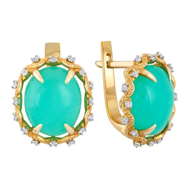 Серьги из жёлтого золота с зелёным опалом и бесцветными сапфирами (043434)