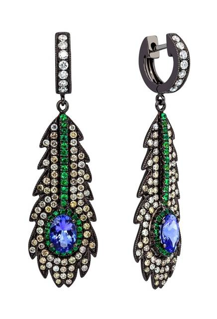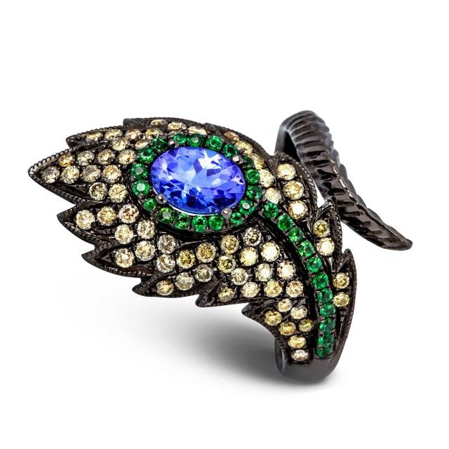 Кольцо с бриллиантами, зелёными гранатами и танзанитом из чёрного золота (015279)