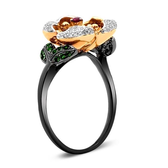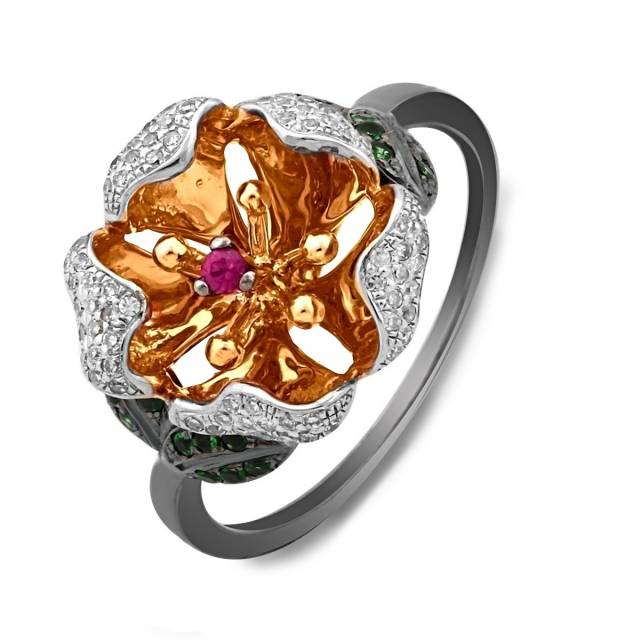 Кольцо из комбинированного золота с бриллиантами, тсаваритами и розовым сапфиром (011456)
