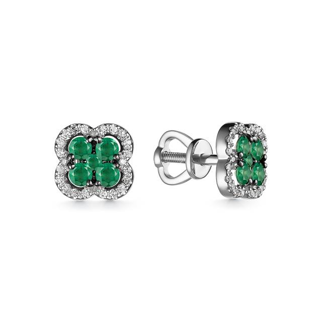 Серьги пусеты из белого золота с бриллиантами и изумрудами (055209)